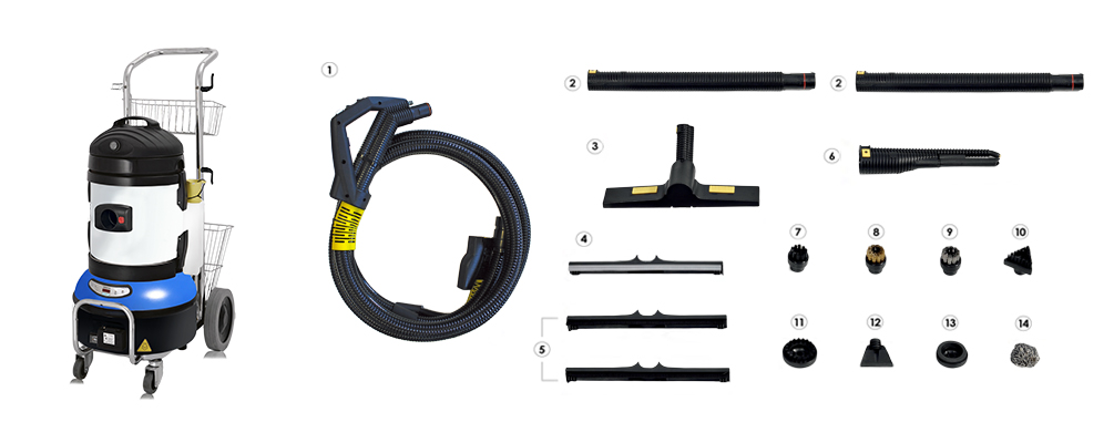 1.6 bar蒸汽软管(3 m)。2.延长管。3.矩形刷。4.大三角刷。5.窗户清洁刷。6.蒸汽枪头。7.Ø28尼龙刷。8.Ø28黄铜刷。9.Ø28不锈钢刷。10.蒸汽铲。11.Ø60蒸汽活塞刷。12.Ø60尼龙刷。13.三角刷。14.钢丝绒垫。
